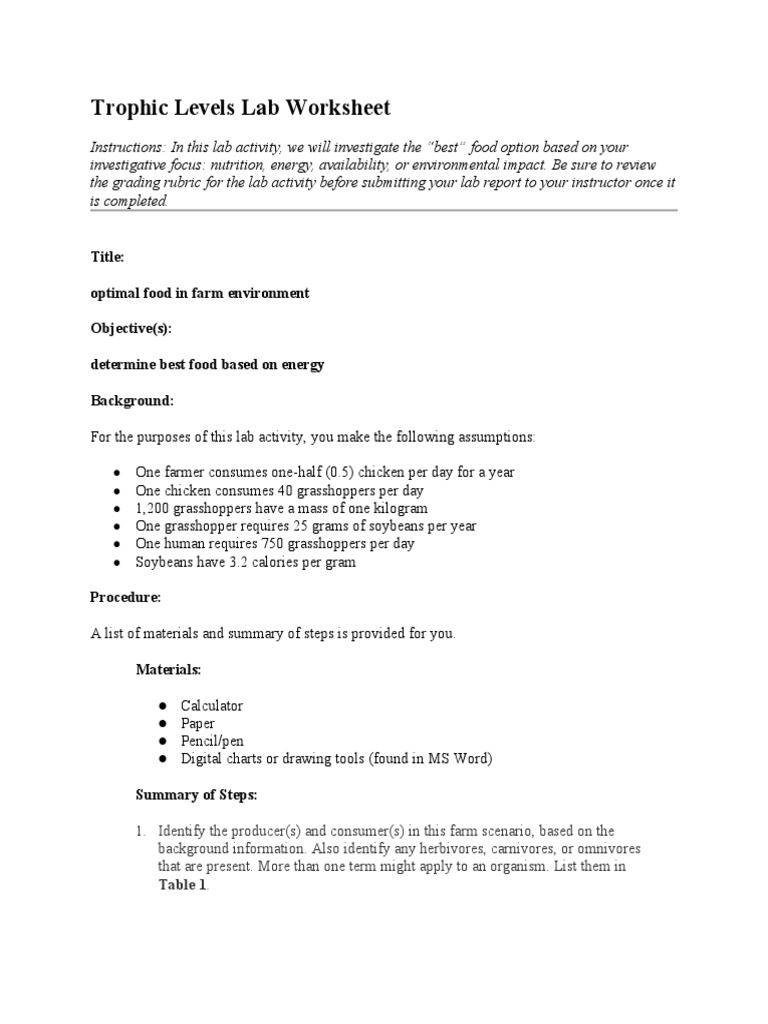 investigative focus: nutrition, energy, availability, or environmental impact. Be sure to review