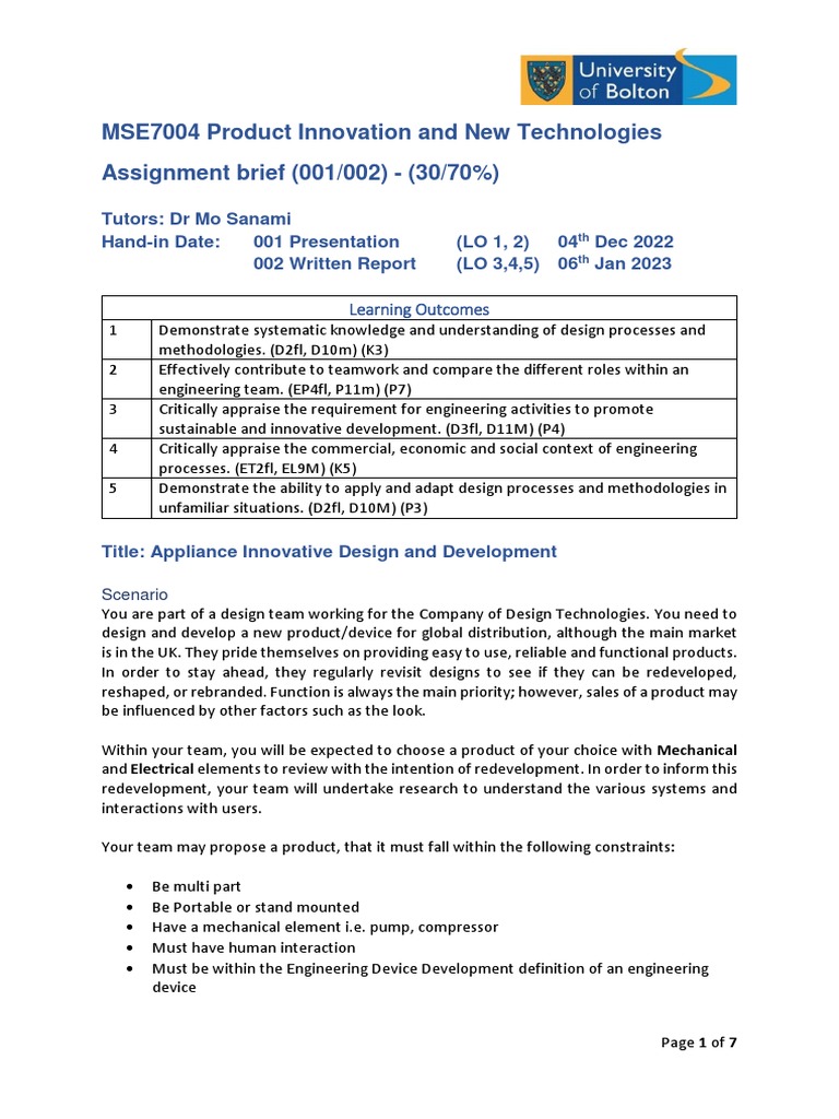 Within your team, you will be expected to choose a product of your choice with Mechanical
