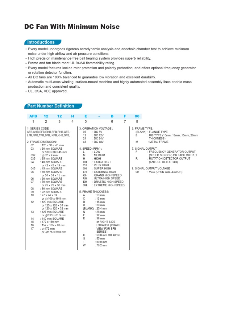 3. OPERATION VOLTAGE : 05 : DC 5V 12 : DC 12V 24 : DC 24V 48 : DC 48V 4. SPEED (RPM) : L : LOW M : MEDIUM H : HIGH HH : EXTRA HIGH VH : VERY HIGH SH : SUPER HIGH EH : EXTERNAL HIGH GH : GRAND HIGH SPEED UH : ULTRA HIGH SPEED DH : DRASTIC HIGH SPEED XH : EXTREME HIGH SPEED 5. FRAME THICKNESS: A : 10 mm C : 13 mm B : 15 mm D : 20 mm (BLANK) : 25.4 mm N : 28 mm F : 32 mm E : 38 mm or RIGHT SIDE EXHAUST (INTAKE VIEW FOR BFB SERIES) G : 50.8 mm OR 48mm S : 55 mm T : 69.0 mm W : 76.2 mm