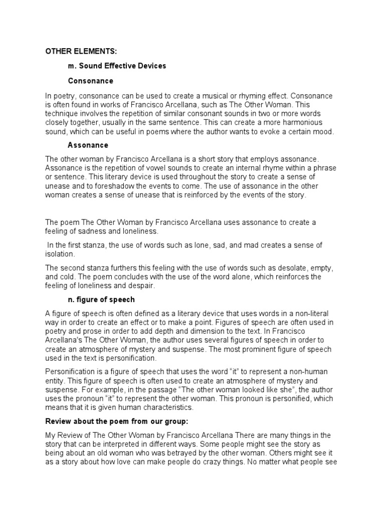 The poem The Other Woman by Francisco Arcellana uses assonance to create a