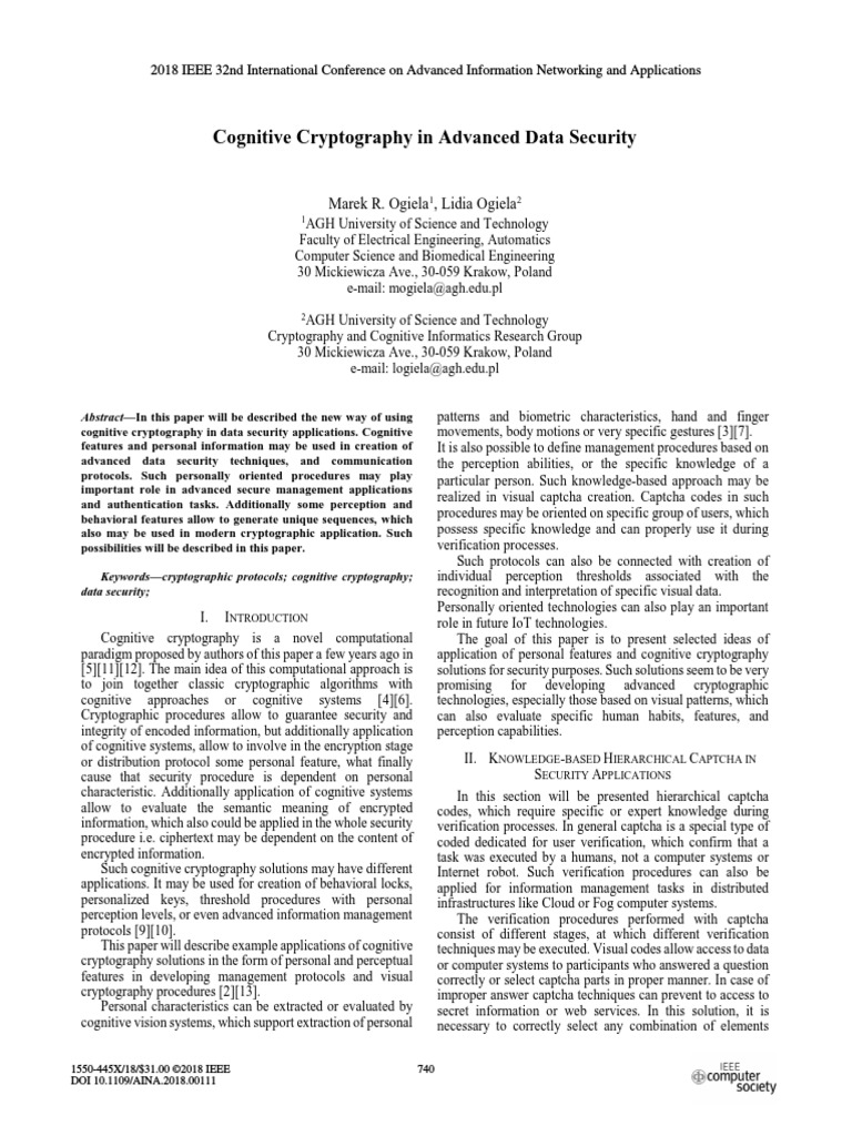 Cognitive cryptography is a novel computational The goal of this paper is to present selected ideas of