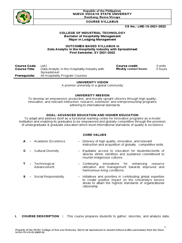 and core values of 2.1 Course Outline NVSU Hymn and express values of a true