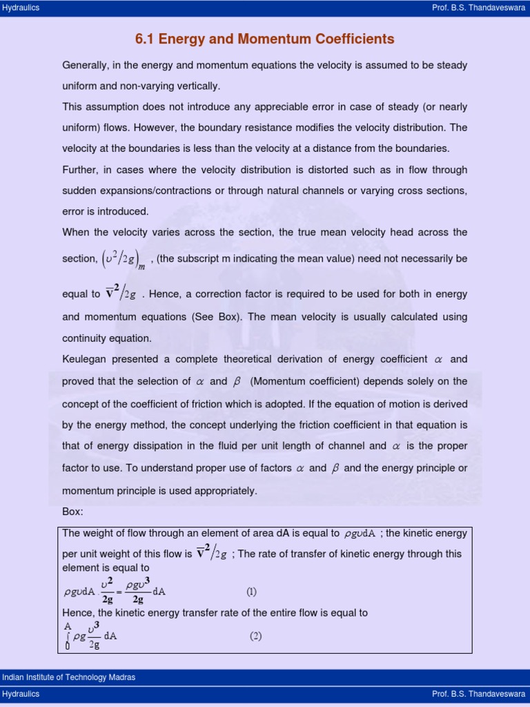 Generally, in the energy and momentum equations the velocity is assumed to be steady uniform and non-varying vertically. This assumption does not introduce any appreciable error in case of steady (or nearly uniform) flows. However, the boundary resistance modifies the velocity distribution. The velocity at the boundaries is less than the velocity at a distance from the boundaries. Further, in cases where the velocity distribution is distorted such as in flow through sudden expansions/contractions or through natural channels or varying cross sections, error is introduced. When the velocity varies across the section, the true mean velocity head across the section, 2 2g 2