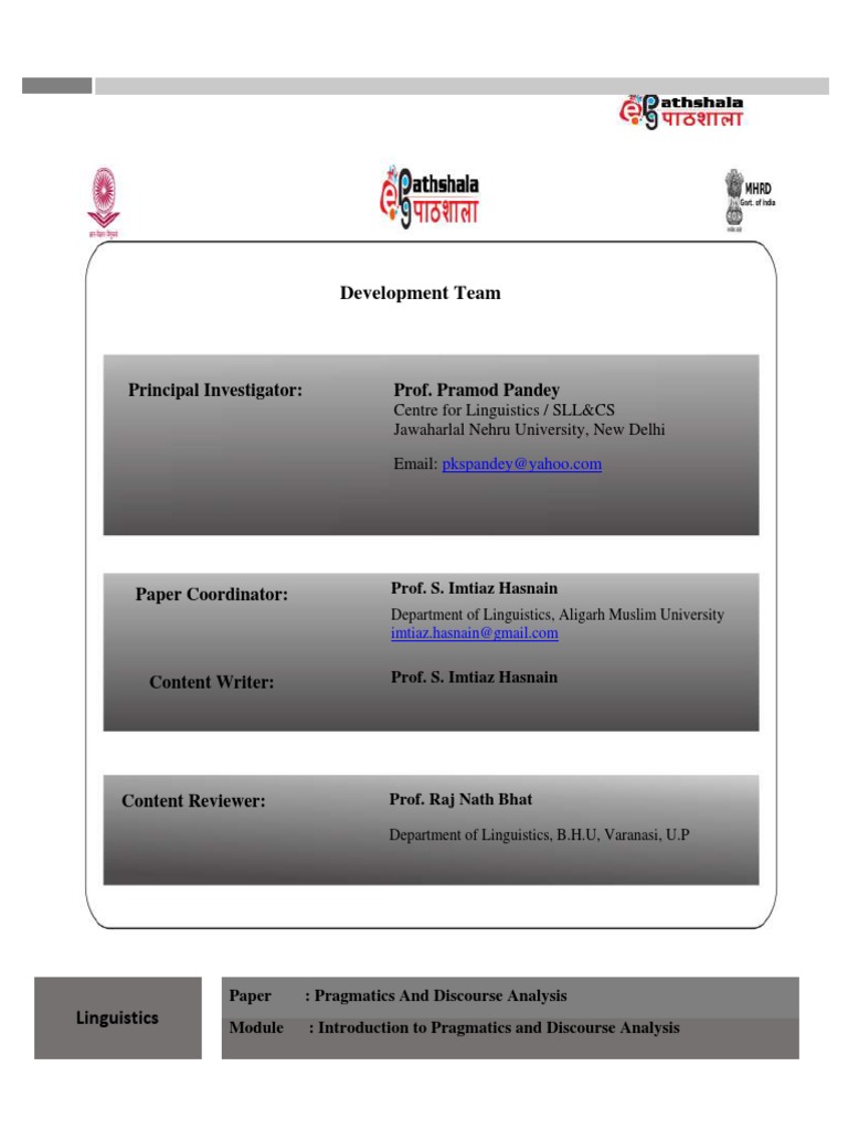 Linguistics Module : Introduction to Pragmatics and Discourse Analysis