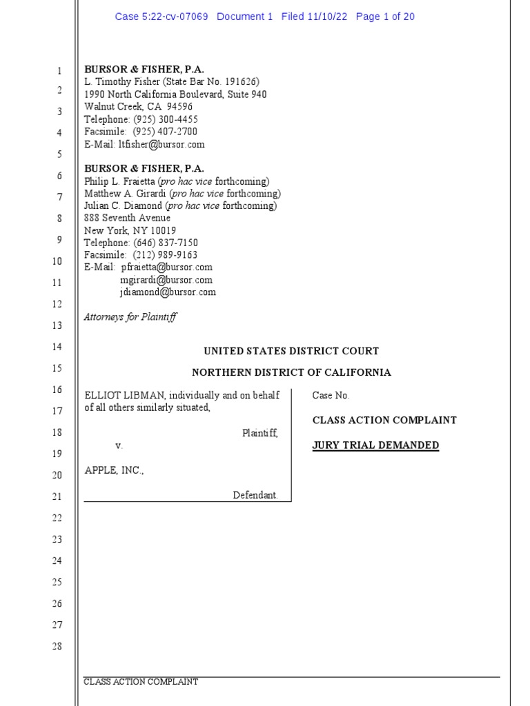 2 all others similarly situated against Defendant Apple, Inc. (hereinafter “Defendant” or “Apple”).