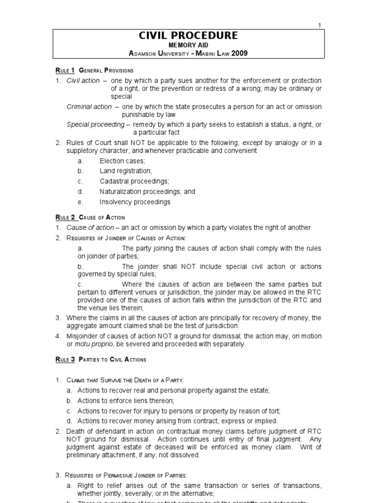 RULE 2 CAUSE OF ACTION 1. Cause of action an act or omission by which a party violates the right of another 2. REQUISITES OF JOINDER OF CAUSES OF ACTION: a. The party joining the causes of action shall comply with the rules on joinder of parties; b. The joinder shall NOT include special civil action or actions governed by special rules; c. Where the causes of action are between the same parties but pertain to different venues or jurisdiction, the joinder may be allowed in the RTC provided one of the causes of action falls within the jurisdiction of the RTC and the venue lies therein; 3. Where the claims in all the causes of action are principally for recovery of money, the aggregate amount claimed shall be the test of jurisdiction. 4. Misjoinder of causes of action NOT a ground for dismissal; the action may, on motion or motu proprio, be severed and proceeded with separately. RULE 3 PARTIES TO CIVIL ACTIONS 1. CLAIMS THAT SURVIVE THE DEATH OF A PARTY: a. Actions to recover real and personal property against the estate; b. Actions to enforce liens thereon; c. Actions to recover for injury to persons or property by reason of tort; d. Actions to recover money arising from contract, express or implied. 2. Death of defendant in action on contractual money claims before judgment of RTC NOT ground for dismissal. Action continues until entry of final judgment. Any judgment against estate of deceased will be enforced as money claim. Writ of preliminary attachment, if any, not dissolved. 3. REQUISITES OF PERMISSIVE JOINDER OF PARTIES: a. Right to relief arises out of the same transaction or series of transactions, whether jointly, severally, or in the alternative; b. There is a question of law or fact common to all the plaintiffs and defendants; c. Such joinder is not otherwise proscribed by the provisions of the Rules on jurisdiction and venue.