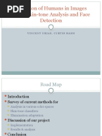 skin colors occurring in the images we have build a skin pixels classier based on the statistical theory of pattern recognition, which was rst implemented by Jones and Rehg [8]. To detect faces in the scene, we have attempt to build a multi color model of the human face using the color of skin lips and hair and a similar statistical approach. But we have found this model to be too erroneous for any robust application. Instead, we have proposed a connected component analysis, interconnected with a segmentation method based on the color. Finally we apply a very simple validation scheme for the face detection based on the shape features of the human face. The report is arranged in the following way. Chapter 2 introduces several projects solving human tracking and detection tasks, generally based on the color. Then the used training image datasets are briey mentioned in the chapter 3 and the statistical approach, solving skin detection problem is analyzed in the chapter 4. The proposed multicolor face model is outlined in the chapter 5 and results are shown. Then the proposed segmentation technique is reported and examined in the chapter 6 and the nal algorithm for the face localization together with the simple verication scheme is presented in the chapter 7. Finally the results are discussed in the chapter 8.
