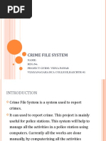 Crime File System is a system used to report crimes. This project will be done using VB 6.0 as front end, and MS Access as back end. It can used to report crime. This project is mainly useful for police stations. This system will help to manage all the activities in a police station using computers. Currently all the works are done manually, by computerizing all the activities inside a police station can be managed easily and effectively.