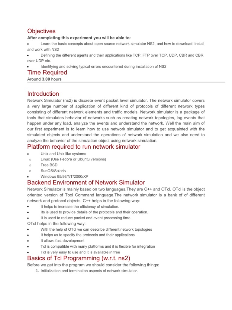 Learn the basic concepts about open source network simulator NS2, and how to download, install and work with NS2 Defining the different agents and their applications like TCP, FTP over TCP, UDP, CBR and CBR y over UDP etc. Identifying and solving typical errors encountered during installation of NS2 y y