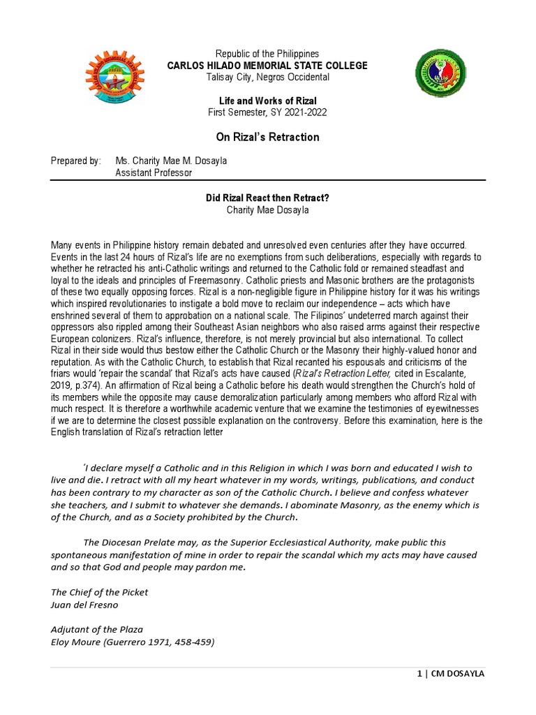 friars would ‘repair the scandal’ that Rizal’s acts have caused (Rizal’s Retraction Letter, cited in Escalante,