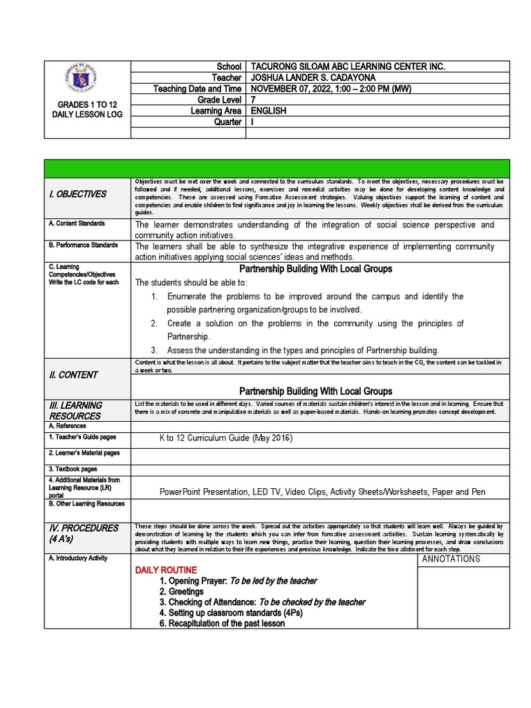 IV. PROCEDURES These steps should be done across the week. Spread out the activities appropriately so that students will learn well. Always be guided by