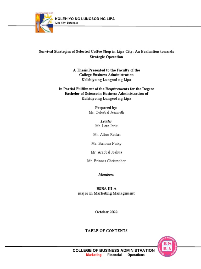 This study aimed to assess the Survival strategies of Selected Coffee Shop in Lipa