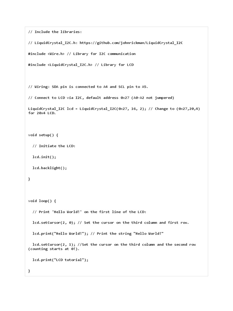 // Connect to LCD via I2C, default address 0x27 (A0-A2 not jumpered)