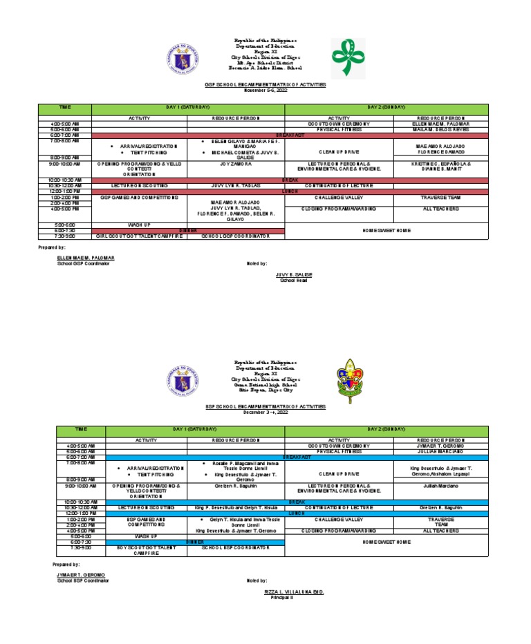 BSP SCHOOL ENCAMPMENT MATRIX OF ACTIVITIES