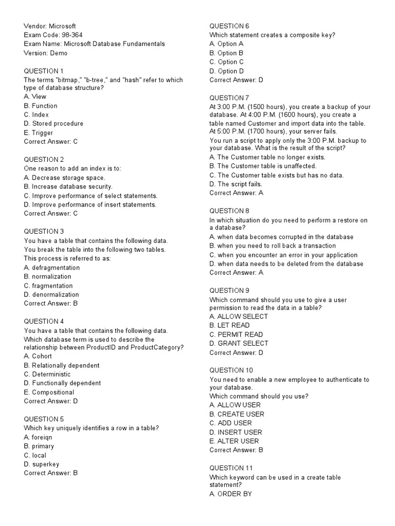 Exam Name: Microsoft Database Fundamentals A. Option A