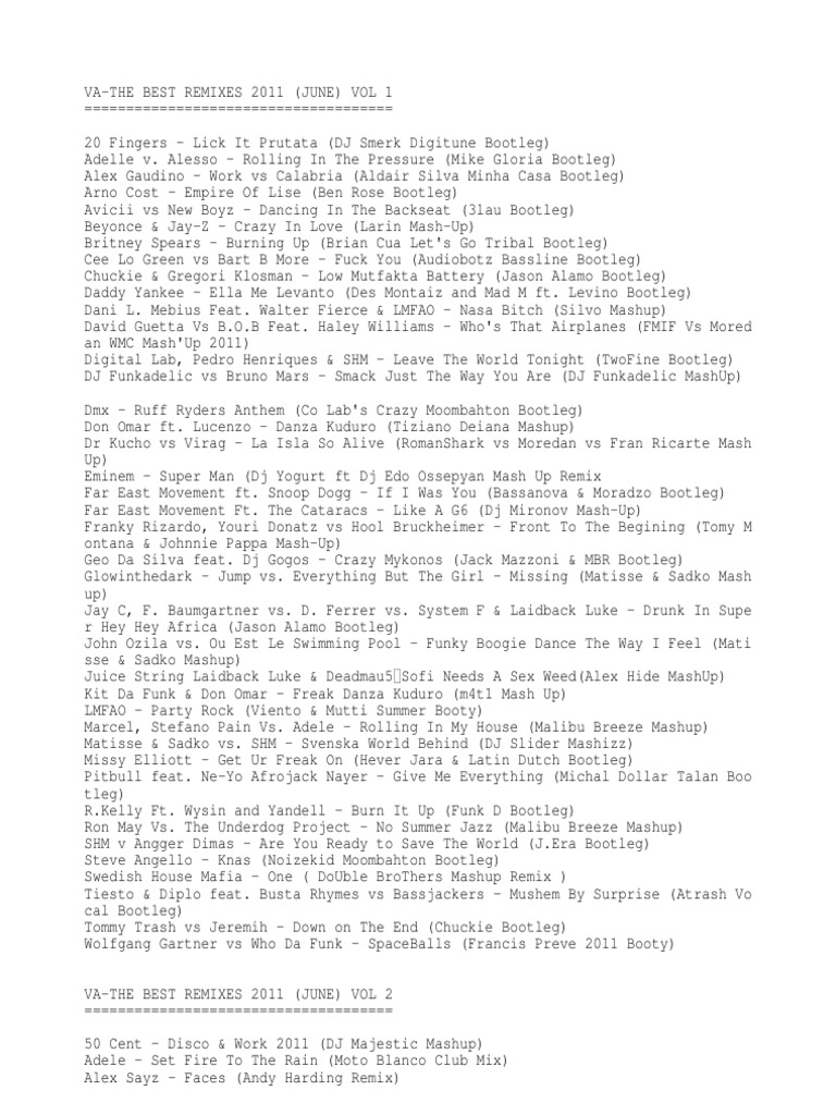 VA-THE BEST REMIXES 2011 (JUNE) VOL 15 ====================================== Afrojack vs. U2 - WIth Or Without Techno Fan (Doc Brown Bootleg) Alexandra Stan - Mr Saxobeat (Miggs Rixs Delanoise Did It Again Bootleg) Avicii vs Martin Solveig vs Axwell - Hello, I Found Levels (Gauffie Mashup) Black Eyed Peas - My Humps (DJ Solovey Remix) Britney Spears - Gasoline (Martin & Souza 126 Club Mix) Bryan Adams - Run To You (Cheb'Five Remix) David Guetta & Felix - Dont You Want Me (DJ Nejtrino & DJ Stranger Remix) David Guetta feat. Flo Rida & Nicki Minaj - Where Them Girls At (Tim Mason Remix ) Dirty Money (feat. Skylar Grey) - Coming Home (Dark Intensity Mix) Dirty South - Let It Go (Big Mak Radio Mix) Dmx - Ruff Ryders Anthem (Co Lab's Crazy Moombahton Bootleg) Don Omar feat Lucenzo - Danza Kuduro (Mark Pride Remix) Don Omar feat. Lucenzo - Danza Kuduro 2011 (Alessandro Vinai Bootleg Remix) Dr. Dre & Eminem - I Need A Doctor (M-Tronic Remix) Grace - When The Lights Go Down (Seamus Haji Club Mix) Grace - When The Lights Go Down (Seamus Haji Radio Edit) Grace - When The Lights Go Down (Wideboys Club Mix) Grace - When The Lights Go Down (Wideboys Radio Edit) Ian Oliver Feat. Shantel - Bucovina (Roger Slato 2011 Remix) Jason Derulo - Don't Wanna Go Home (Mercmonk Club Mix) Kaskade Feat. Haley - Dynasty 2011 (Roger Slato & Ferry Ross 'Paradise' Bootleg) Kaskade vs Avicii - Sorry Bom (Kaskade Bootleg) Katy Perry - E.T. (Nick Barns Remix) Lady GaGa - Judas (Roger Slato ReThink) Lady GaGa - The Edge Of Glory (Electrolightz Remix) Livvi Franc - Now I'm That Bitch (Discotech Remix) Livvi Franc - Now I'm That Bitch (Jason Nevins Club) Livvi Franc - Now I'm That Bitch (Serafin Remix) Martin Solveig ft. Dragonette & Idoling - Big In Japan (Single Edit) Paolo Mojo - All Night All Right (Manuel De La Mare Remix) Pitbull, Ne-Yo - Give Me Everything (Robin Riccio Bootleg) Promise Land, Dimitri Vegas, Like Mike vs Johnny Buss, Hard Rock Sofa - Do You F eel Heaven (Munich House Mafia Bootleg) Rihanna - Rude Boy (Peter Rauhofer Private Mix) Samuele Sartini feat. Katherine Ellis - Jumping (Crazibiza Vocal Remix) Samuele Sartini feat. Katherine Ellis - Jumping (Original Extended) SHM v Angger Dimas - Are You Ready to Save The World (J.Era Bootleg) Sting - Englishman in New York (Musicarus House Edit) Swedish House Mafia ft. John Martin - Save The Crying World (Christopher Doom Ed it) Swedish House Mafia ft. John Martin - Save The World Tonight (Makj Bootleg) VA-THE BEST REMIXES 2011 (JUNE) VOL 16 ====================================== 50 Cent Vs. Acid Luke - Disco Inferno (Dj Denny Joker Mash Up) Alex Gaudino - I'm In Love (I Wanna Do It) (Sam Wallace's Summer 2011 Remix) ArDeeJay Axwell & Dirty South feat. Rudy Open Your Heart(ArDeeJay Remix) Avicii - Sweet Dreams (Timo Juuti & Hector 87 Remix) Avicii - Sweet Dreams (Cazzette meet At Night Mix) Deadmau5 vs Iio - Rapture of Ghosts N Stuff (SubBuzz Rmx) Diplo Vs. Tiesto - C'mon Ft. Busta Rhymes (Swerve Remix) Dj Samuel Kimko - Baila Baila (Original Porno Mix) Don Omar feat Pitbull & Real to Real - I Like danza Kuduro (Dj Chrys Mashup 2011 )