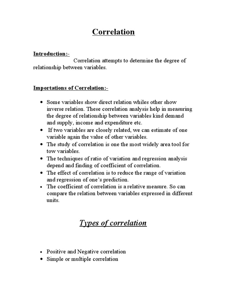 Introduction:Correlation attempts to determine the degree of relationship between variables. Importations of Correlation: Some variables show direct relation whiles other show inverse relation. These correlation analysis help in measuring the degree of relationship between variables kind demand and supply, income and expenditure etc. If two variables are closely related, we can estimate of one variable again the value of other variables. The study of correlation is one the most widely area tool for tow variables. The techniques of ratio of variation and regression analysis depend and finding of coefficient of correlation. The effect of correlation is to reduce the range of variation and regression of ones prediction. The coefficient of correlation is a relative measure. So can compare the relation between variables expressed in different units.