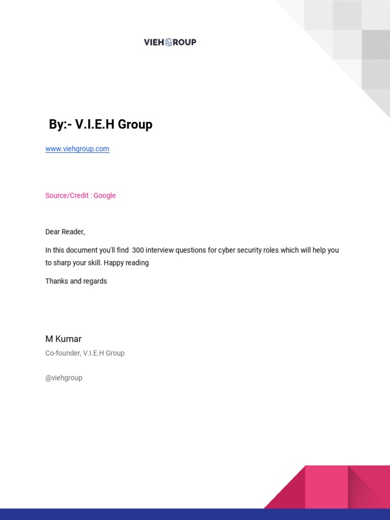 In this document you'll find 300 interview questions for cyber security roles which will help you