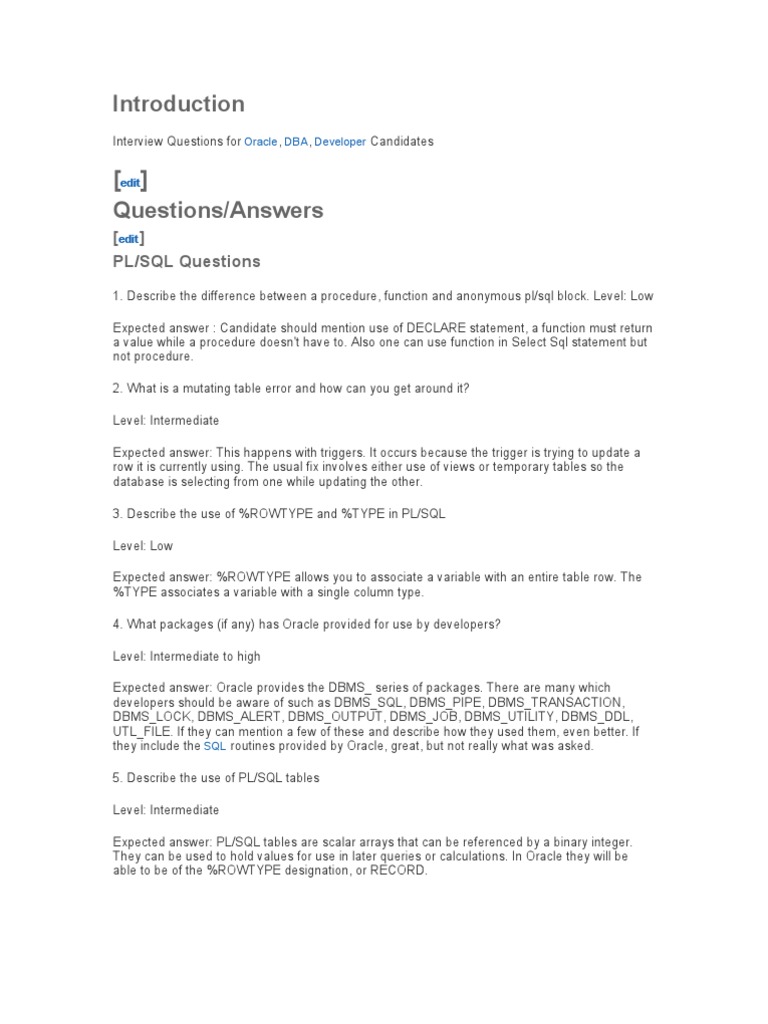1. Describe the difference between a procedure, function and anonymous pl/sql block. Level: Low Expected answer : Candidate should mention use of DECLARE statement, a function must return a value while a procedure doesn't have to. Also one can use function in Select Sql statement but not procedure. 2. What is a mutating table error and how can you get around it? Level: Intermediate Expected answer: This happens with triggers. It occurs because the trigger is trying to update a row it is currently using. The usual fix involves either use of views or temporary tables so the database is selecting from one while updating the other. 3. Describe the use of %ROWTYPE and %TYPE in PL/SQL Level: Low Expected answer: %ROWTYPE allows you to associate a variable with an entire table row. The %TYPE associates a variable with a single column type. 4. What packages (if any) has Oracle provided for use by developers? Level: Intermediate to high Expected answer: Oracle provides the DBMS_ series of packages. There are many which developers should be aware of such as DBMS_SQL, DBMS_PIPE, DBMS_TRANSACTION, DBMS_LOCK, DBMS_ALERT, DBMS_OUTPUT, DBMS_JOB, DBMS_UTILITY, DBMS_DDL, UTL_FILE. If they can mention a few of these and describe how they used them, even better. If they include the SQL routines provided by Oracle, great, but not really what was asked. 5. Describe the use of PL/SQL tables Level: Intermediate Expected answer: PL/SQL tables are scalar arrays that can be referenced by a binary integer. They can be used to hold values for use in later queries or calculations. In Oracle they will be able to be of the %ROWTYPE designation, or RECORD.