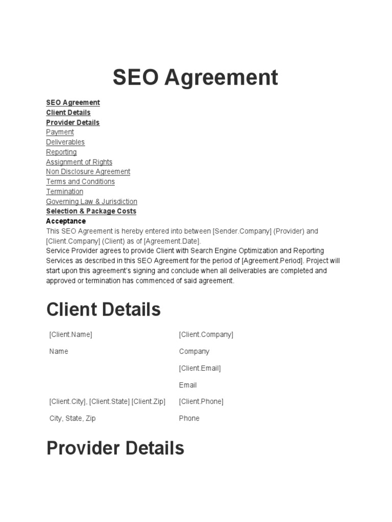This SEO Agreement is hereby entered into between [Sender.Company] (Provider) and