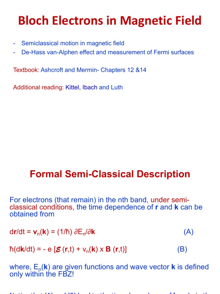 dr/dt = v(k) = (1/ħ) ∂E/∂k ……… (1) ħdk/dt = - e(v x B) ………… (2)