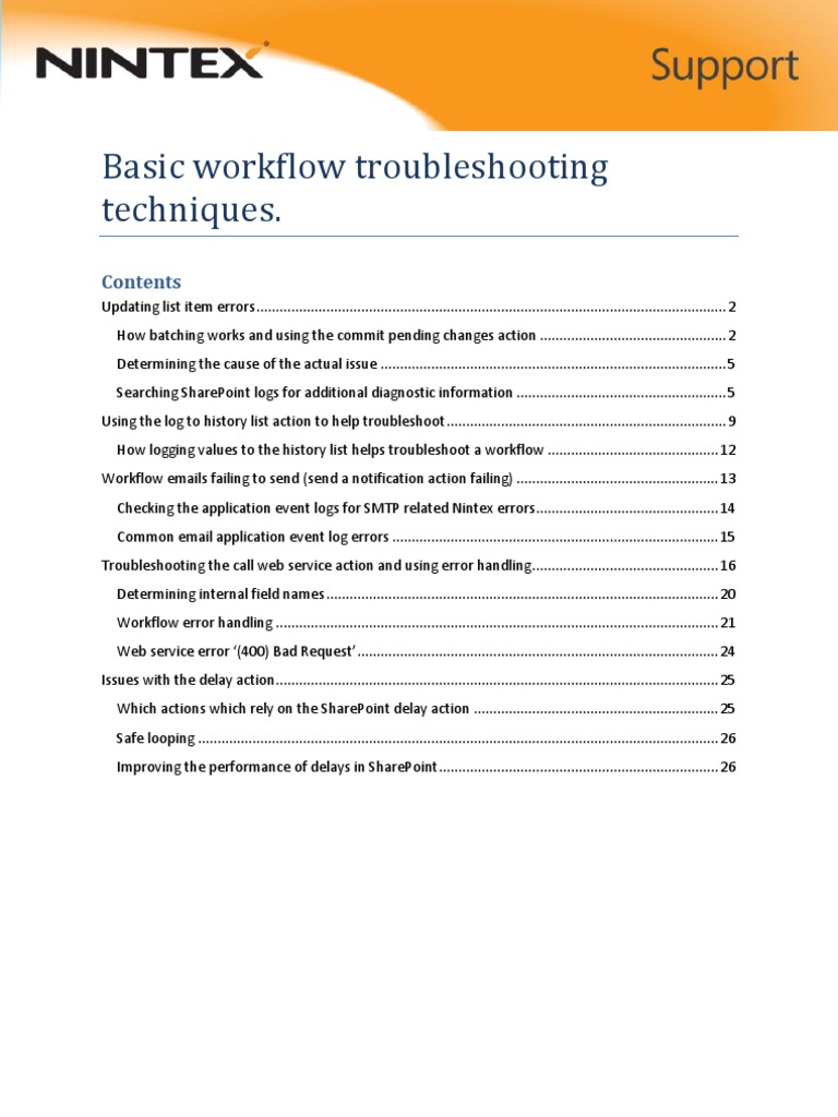Updating list item errors ......................................................................................................................... 2 How batching works and using the commit pending changes action ................................................ 2 Determining the cause of the actual issue ......................................................................................... 5 Searching SharePoint logs for additional diagnostic information ...................................................... 5 Using the log to history list action to help troubleshoot ........................................................................ 9 How logging values to the history list helps troubleshoot a workflow ............................................ 12 Workflow emails failing to send (send a notification action failing) .................................................... 13 Checking the application event logs for SMTP related Nintex errors ............................................... 14 Common email application event log errors .................................................................................... 15 Troubleshooting the call web service action and using error handling ................................................ 16 Determining internal field names ..................................................................................................... 20 Workflow error handling .................................................................................................................. 21 Web service error (400) Bad Request ............................................................................................. 24 Issues with the delay action .................................................................................................................. 25 Which actions which rely on the SharePoint delay action ............................................................... 25 Safe looping ...................................................................................................................................... 26 Improving the performance of delays in SharePoint ........................................................................ 26