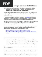 Obama: Defaulting On Our Obligations Is A Reckless And Irresponsible Outcome To This Debate. OBAMA: If that happens, and we default, we would not have enough money to pay all of our bills - bills that include monthly Social Security checks, veterans' benefits, and the government contracts we've signed with thousands of businesses. For the first time in history, our country's AAA credit rating would be downgraded, leaving investors around the world to wonder whether the United States is still a good bet. Interest rates would skyrocket on credit cards, on mortgages and on car loans, which amounts to a huge tax hike on the American people. We would risk sparking a deep economic crisis - this one caused almost entirely by Washington. So defaulting on our obligations is a reckless and irresponsible outcome to this debate. And Republican leaders say that they agree we must avoid default. (President Barack Obama, Address To The Nation On The Federal Debt Ceiling, 7/25/11)