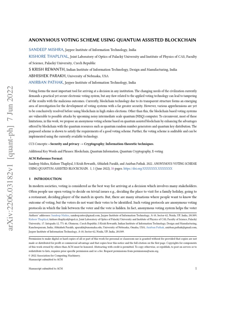 Additional Key Words and Phrases: Blockchain, Quantum Information, Quantum Cryptography, E-voting