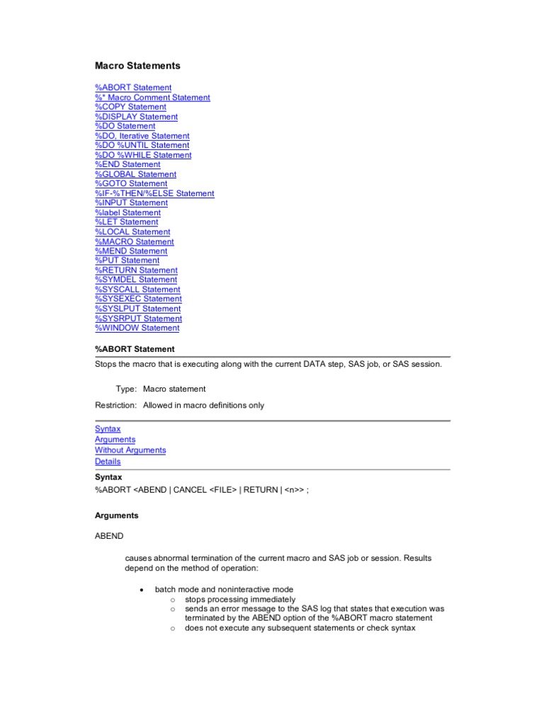 Details The %ABORT macro statement causes SAS to stop processing the current macro and DATA step. Whathappensnextdependson y y y the method you use to submit your SAS statements the arguments you use with %ABORT youroperatingenvironment.
