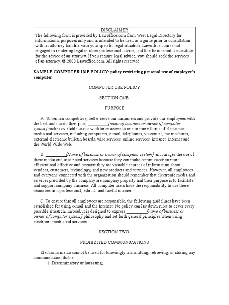 SAMPLE COMPUTER USE POLICY: policy restricting personal use of employer’s