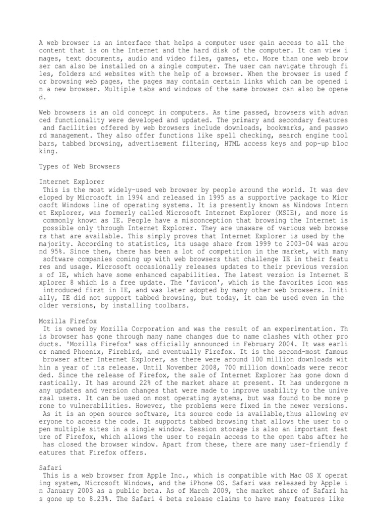 and the hard disk of the computer. It can view i mages, text documents, audio and video files, games, etc. More than one web brow ser can also be installed on a single computer. The user can navigate through fi les, folders and websites with the help of a browser. When the browser is used f or browsing web pages, the pages may contain certain links which can be opened i n a new browser. Multiple tabs and windows of the same browser can also be opene d. Web browsers is an old concept in computers. As time passed, browsers with advan ced functionality were developed and updated. The primary and secondary features and facilities offered by web browsers include downloads, bookmarks, and passwo rd management. They also offer functions like spell checking, search engine tool bars, tabbed browsing, advertisement filtering, HTML access keys and pop-up bloc king. Types of Web Browsers Internet Explorer This is the most widely-used web browser by people around the world. It was dev eloped by Microsoft in 1994 and released in 1995 as a supportive package to Micr osoft Windows line of operating systems. It is presently known as Windows Intern et Explorer, was formerly called Microsoft Internet Explorer (MSIE), and more is commonly known as IE. People have a misconception that browsing the Internet is possible only through Internet Explorer. They are unaware of various web browse rs that are available. This simply proves that Internet Explorer is used by the majority. According to statistics, its usage share from 1999 to 2003-04 was arou nd 95%. Since then, there has been a lot of competition in the market, with many software companies coming up with web browsers that challenge IE in their featu res and usage. Microsoft occasionally releases updates to their previous version s of IE, which have some enhanced capabilities. The latest version is Internet E xplorer 8 which is a free update. The 'favicon', which is the favorites icon was introduced first in IE, and was later adopted by many other web browsers. Initi ally, IE did not support tabbed browsing, but today, it can be used even in the older versions, by installing toolbars. Mozilla Firefox It is owned by Mozilla Corporation and was the result of an experimentation. Th is browser has gone through many name changes due to name clashes with other pro ducts. 'Mozilla Firefox' was officially announced in February 2004. It was earli er named Phoenix, Firebird, and eventually Firefox. It is the second-most famous browser after Internet Explorer, as there were around 100 million downloads wit hin a year of its release. Until November 2008, 700 million downloads were recor ded. Since the release of Firefox, the sale of Internet Explorer has gone down d rastically. It has around 22% of the market share at present. It has undergone m any updates and version changes that were made to improve usability to the unive rsal users. It can be used on most operating systems, but was found to be more p rone to vulnerabilities. However, the problems were fixed in the newer versions. As it is an open source software, its source code is available,thus allowing ev eryone to access the code. It supports tabbed browsing that allows the user to o pen multiple sites in a single window. Session storage is also an important feat ure of Firefox, which allows the user to regain access to the open tabs after he has closed the browser window. Apart from these, there are many user-friendly f eatures that Firefox offers. Safari This is a web browser from Apple Inc., which is compatible with Mac OS X operat ing system, Microsoft Windows, and the iPhone OS. Safari was released by Apple i n January 2003 as a public beta. As of March 2009, the market share of Safari ha s gone up to 8.23%. The Safari 4 beta release claims to have many features like