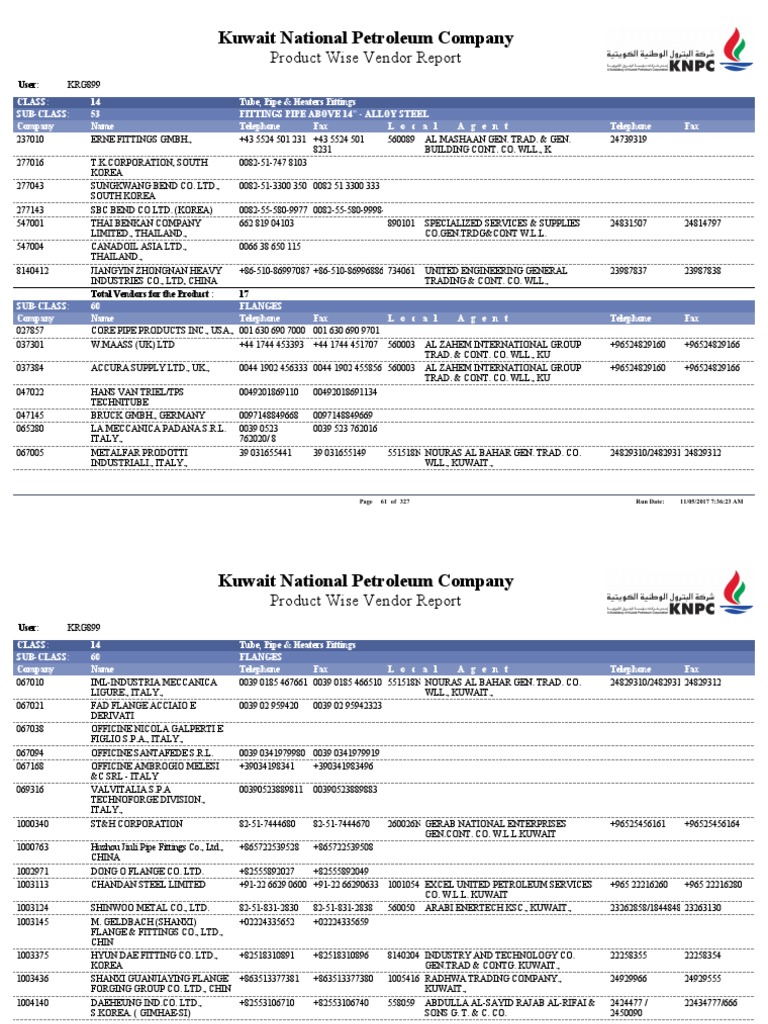 177068 CHW FORGE PRIVATE LIMITED., +91 120 4388000 +91 120 556952 PETROLEUM SERVICES CO., KUWAIT 24610801/2/3 24610805/6