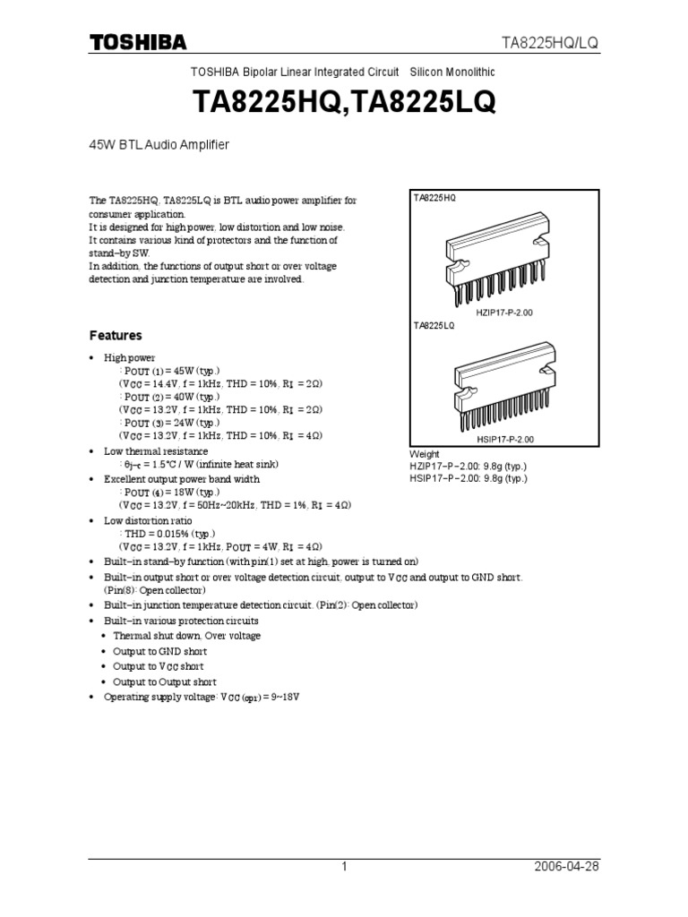 The TA8225HQ, TA8225LQ is BTL audio power amplifier for TA8225HQ