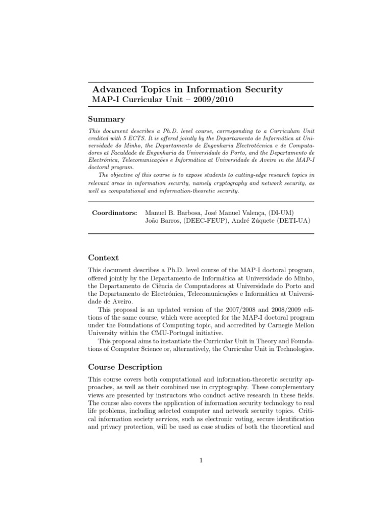 This document describes a Ph.D. level course, corresponding to a Curriculum Unit credited with 5 ECTS. It is oered jointly by the Departamento de Informtica at Unia versidade do Minho, the Departamento de Engenharia Electrotcnica e de Computae dores at Faculdade de Engenharia da Universidade do Porto, and the Departamento de Electrnica, Telecomunicaoes e Informtica at Universidade de Aveiro in the MAP-I o c a doctoral program. The objective of this course is to expose students to cutting-edge research topics in relevant areas in information security, namely cryptography and network security, as well as computational and information-theoretic security.