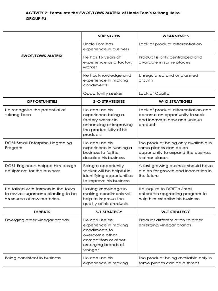 ACTIVITY 2: Formulate the SWOT/TOWS MATRIX of Uncle Tom’s Sukang Iloko