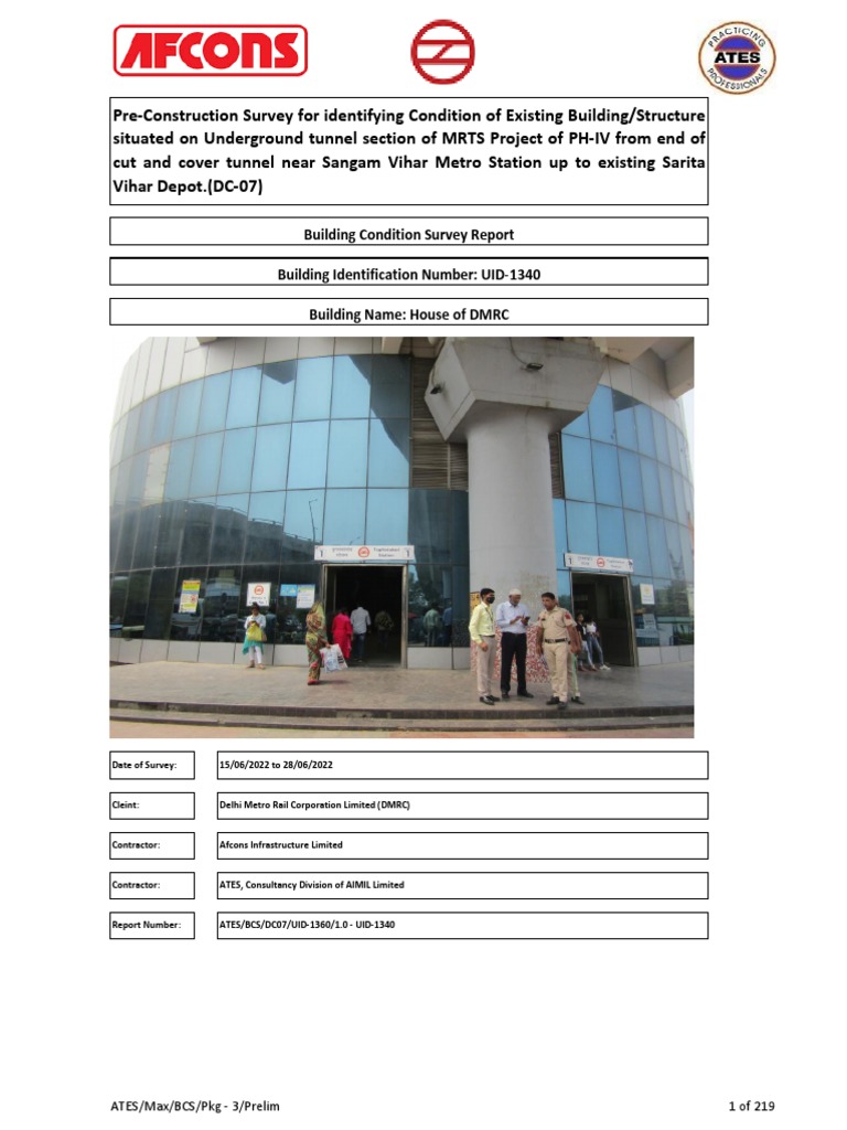 To carry out existing condition survey of building and structures falling in the influence zone of tunnel alignment of DMRC Package DC07. The