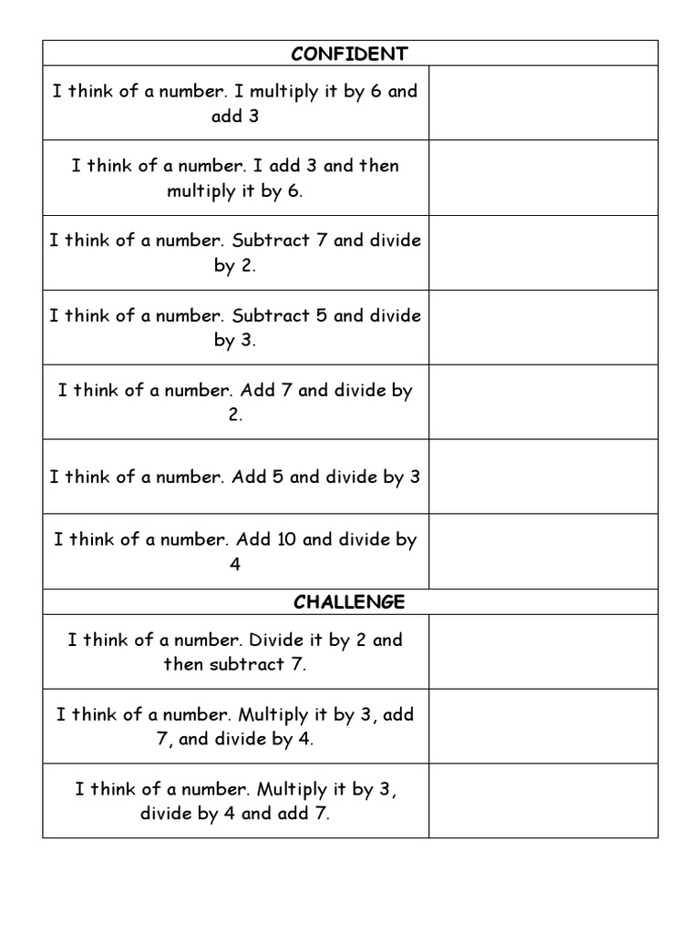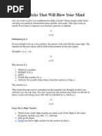 The document provides a series of math problems where the reader thinks of a number and then performs an operation on that number such as adding, subtracting, multiplying, or dividing. The problems start out simple and become increasingly complex, moving from addition and subtraction to more complicated operations like multiplying, dividing, and combining operations.