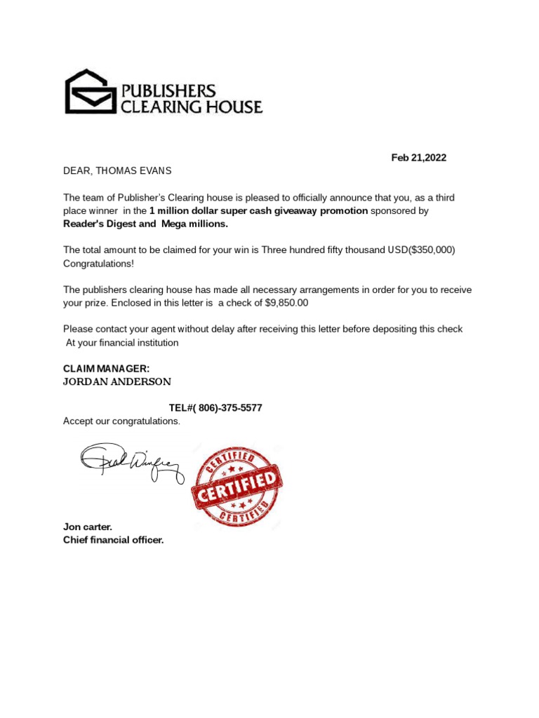 The team of Publisher’s Clearing house is pleased to officially announce that you, as a third