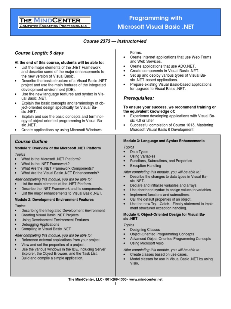 Module 1: Overview of the Microsoft .NET Platform Topics What Is the Microsoft .NET Platform? What Is the .NET Framework? What Are the .NET Framework Components? What Are the Visual Basic .NET Enhancements? After completing this module, you will be able to: List the main elements of the .NET Platform. Describe the .NET Framework and its components. List the major enhancements to Visual Basic .NET. Module 2: Development Environment Features Topics Describing the Integrated Development Environment Creating Visual Basic .NET Projects Using Development Environment Features Debugging Applications Compiling in Visual Basic .NET After completing this module, you will be able to: Reference external applications from your project. View and set the properties of a project. Use the various windows in the IDE, including Server Explorer, the Object Browser, and the Task List. Build and compile a simple application.