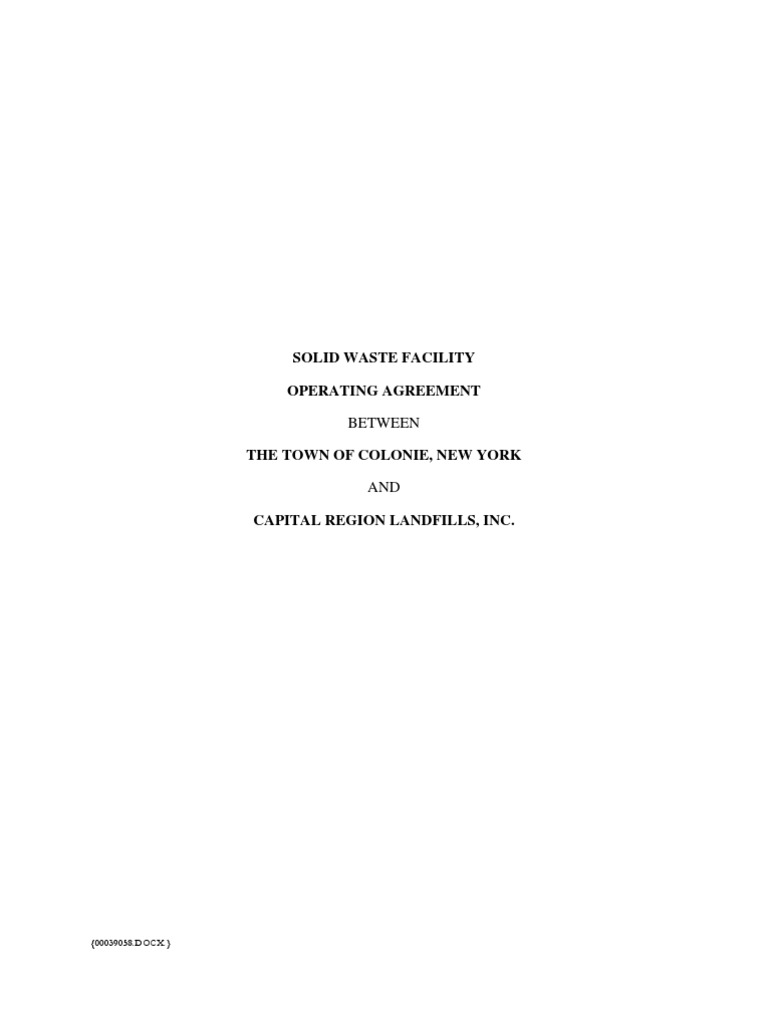 SOLID WASTE FACILITY OPERATING AGREEMENT THIS SOLID WASTE FACILITY OPERATING AGREEMENT (this Agreement), executed as of this ___ day of _____________, 2011, by and between the TOWN OF COLONIE, a municipal corporation of the State of New York, having its principal offices located at Memorial Town Hall, Newtonville, New York 12128 (Town), and CAPITAL REGION LANDFILLS, INC. a New York corporation and wholly-owned subsidiary of WASTE CONNECTIONS, INC., having its principal offices located at 2295 Iron Point Road, Suite 200, Folsom, California 95630 (Company). Town, Company and their respective successors and assigns, are hereinafter sometimes referred to individually as a Party and collectively as the Parties. RECITALS: A. Town is the owner of the Solid Waste Facility (as defined below), which includes the Landfill (as defined below); and B. Town wishes to contract with Company and Company wishes to contract with Town to manage, maintain and operate (including effectuating the Closure (as defined below) of portions of) the Solid Waste Facility, pursuant to the terms and conditions hereof. NOW, THEREFORE, for good and valuable consideration, the receipt and sufficiency of which is hereby acknowledged, and all of the agreements, covenants and conditions herein contained, Town and Company hereby agree as follows: I. Incorporation of Recitals; Definitions