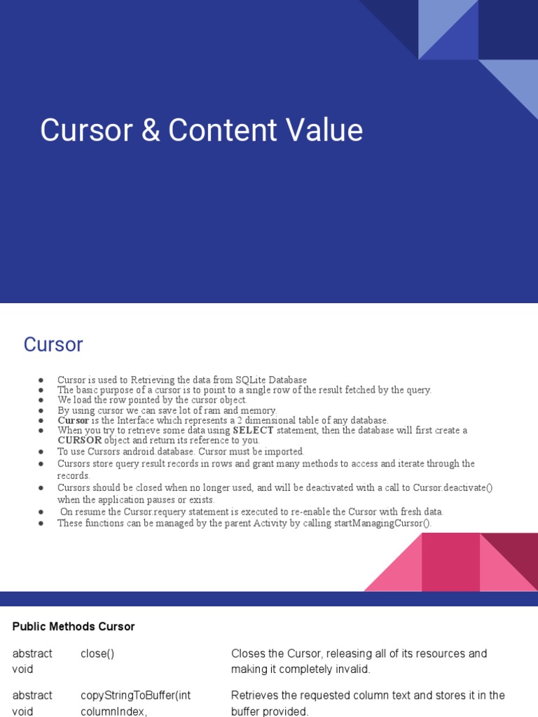 ● query() This method receives a request from a client. The result is returned as a Cursor object.