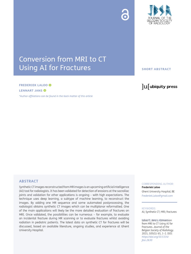 Laloo F, Jans L. Conversion from MRI to CT Using AI for Fractures. Journal of the Belgian Society of Radiology. 2021; 105(1): 65, 1–2.