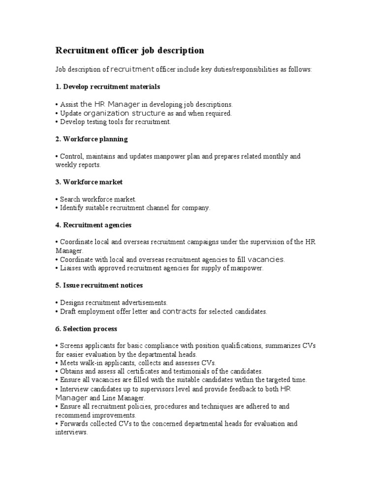 Job description of recruitment officer include key duties/responsibilities as follows: 1. Develop recruitment materials Assist the HR Manager in developing job descriptions. Update organization structure as and when required. Develop testing tools for recruitment. 2. Workforce planning Control, maintains and updates manpower plan and prepares related monthly and weekly reports. 3. Workforce market Search workforce market. Identify suitable recruitment channel for company. 4. Recruitment agencies Coordinate local and overseas recruitment campaigns under the supervision of the HR Manager. Coordinate with local and overseas recruitment agencies to fill vacancies. Liaises with approved recruitment agencies for supply of manpower. 5. Issue recruitment notices Designs recruitment advertisements. Draft employment offer letter and contracts for selected candidates. 6. Selection process Screens applicants for basic compliance with position qualifications, summarizes CVs for easier evaluation by the departmental heads. Meets walk-in applicants, collects and assesses CVs. Obtains and assess all certificates and testimonials of the candidates. Ensure all vacancies are filled with the suitable candidates within the targeted time. Interview candidates up to supervisors level and provide feedback to both HR Manager and Line Manager. Ensure all recruitment policies, procedures and techniques are adhered to and recommend improvements. Forwards collected CVs to the concerned departmental heads for evaluation and interviews.