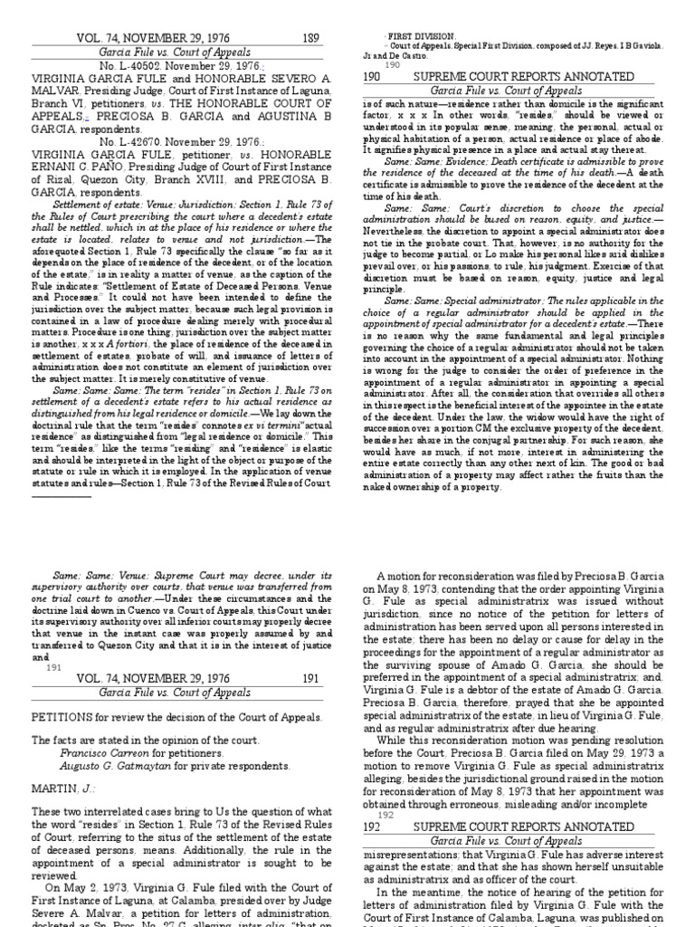 Garcia’s “last place of residence was at Calamba, Laguna.” administratrix, Preciosa B. Garcia did not necessarily waive