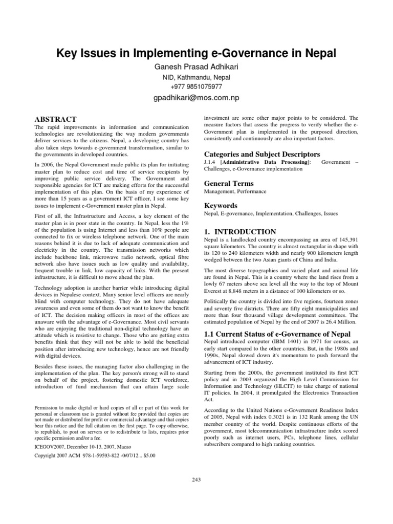 The administration of Government products and services in Nepal is based on traditional way. In this system, increasing efficiency of the civil servants and costumer focus services are not getting priority; delay in services and corruptions are increasing. With the aim to overcome these problems and to improve public service delivery e-Government Master Plan (EGMP) was prepared for the Government of Nepal. It was initiated in January 2005 and Master Plan Consulting Report completed in November 2006 [1]. The vision of EGMP is 'The Value Networking Nepal' through: o o o o Citizen-centered service Transparent service Networked government Knowledge based society