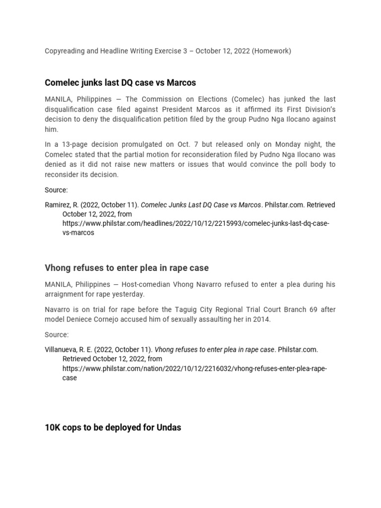 Copyreading and Headline Writing Exercise 3 – October 12, 2022 (Homework)
