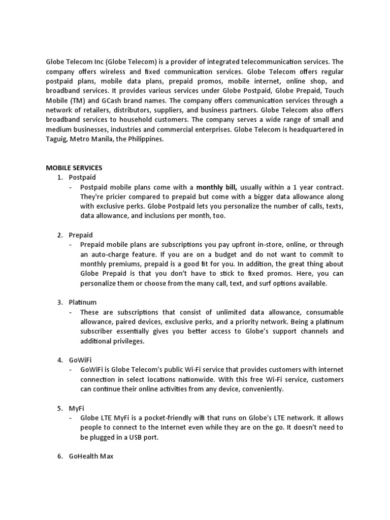 broadband services. It provides various services under Globe Postpaid, Globe Prepaid, Touch