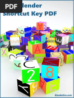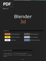 This is just a partial list of Blender commands. Please visit the Blender.org website for more details. TAB keyToggles between edit mode (vertex editing) and object select mode. If youre in edit mode when you create a new object, it will be joined to the selected object. Ctrl ZThe global UNDO command. With each press, one step will be undone (up to 32 steps possible by default). If in edit mode, it will only undo editing steps on the selected object. Space Bar- Brings up a search window to find basic commands. Z keyToggles view from wireframe to solid. Alt ZToggles a texture/shaded view. R keyRotates an object or selected vertices. (pressing X,Y,Z after R will limit effect) S keyScales a selected object or vertices. (pressing X,Y,Z after S will limit effect) G key- Grabs or moves the object or selected vertices. (pressing X,Y,Z after G limits effect) A keyWhile in edit mode its good for selecting all vertices for commands like remove doubles and subdivide. Pressing A twice will clear selected and reselect. Alt APlays animation in selected window. Your cursor must be in that window for it to play. Ctrl AAfter an object has been re-sized and/or rotated, this can reset the objects data to 1 and 0. W key- Brings up a Specials menu while in edit mode of specific edit mode options. Shift-D- Duplicates or copies selected objects or selected vertices. E keyWhile in edit mode, selected vertices can be extruded by pressing E. O key- The O key (not zero) will put you into proportional vertex editing while in edit mode. Proportional editing now also works in object mode. B keyGives you a box (window drag) to select multiple objects. In edit mode, works the same to select multiple vertices. C key- Gives you a circle select in edit mode that can be sized by scrolling the mouse wheel. Press LMB to select, press wheel to deselect. Right mouse click or Esc to exit. Shift-A- Brings up the tools menu where you can add meshes, cameras, lights, etc. Number Pad- Controls your views. 7 top, 1 front, 3 side, 0 camera, 5 perspective, . zooms on selected object, + and zoom in and out. The + - buttons also control affected vertices size in proportional vertex editing. MouseLeft to manipulate (LMB), right to select (RMB), center wheel to zoom and rotate view. If you hold down shift and center wheel you can pan around on the screen. Shift Key- Hold down the shift key to make multiple selections with the right mouse button. Arrow Keys-Used to advance frames in animation. Left/right goes 1 frame at a time, up/down goes 10 frames at a time. P keyWhile in edit mode, pressing P will seperate selected verticies. In object mode, pressing P will cause you to enter into the game (real-time) mode. Press Esc to exit game mode. ATL/CTRL P-Creates or breaks child/parent relationships. To create C/P relationships, hold down shift key and select child first, then parent. Hit Ctrl P. To clear a relationship, do the same except hit Alt P. U keyIn Object Mode, brings up the Single-User menu to unlink materials, animations (IPOs), etc. for linked or copied objects. M key- Moves selected objects to other layers. Ctrl MMirrors an object. Select M, then X,Y,or Z to mirror on that axis. N keyBrings up the numeric info. on a selected object (location, rotation and size). Info. can then be changed in the panel.