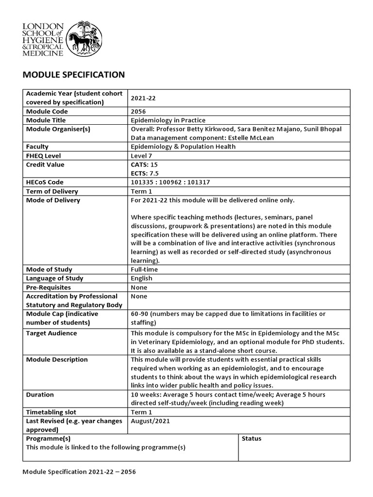 Target Audience This module is compulsory for the MSc in Epidemiology and the MSc