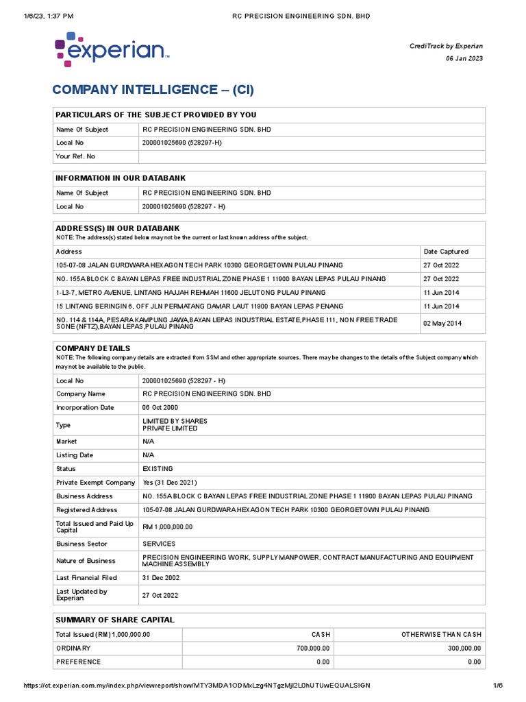 Name Of Subject RC PRECISION ENGINEERING SDN. BHD
